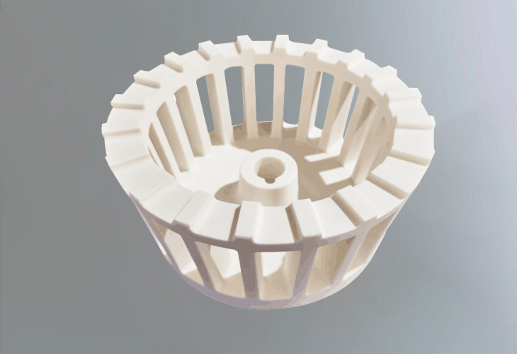 在超細(xì)粉體的加工領(lǐng)域,氣流分級是獲取窄分布、超細(xì)顆粒的重要的手段。分級輪的設(shè)計和制造是分級機的核心工藝。分級輪通常有金屬和陶瓷兩種,對于一些對磁性污染敏感的材料必須采用陶瓷分級輪。目前市場中,用于高速原料粉碎陶瓷雷蒙機,多選用氧化鋯或氧化鋁陶瓷分級輪,